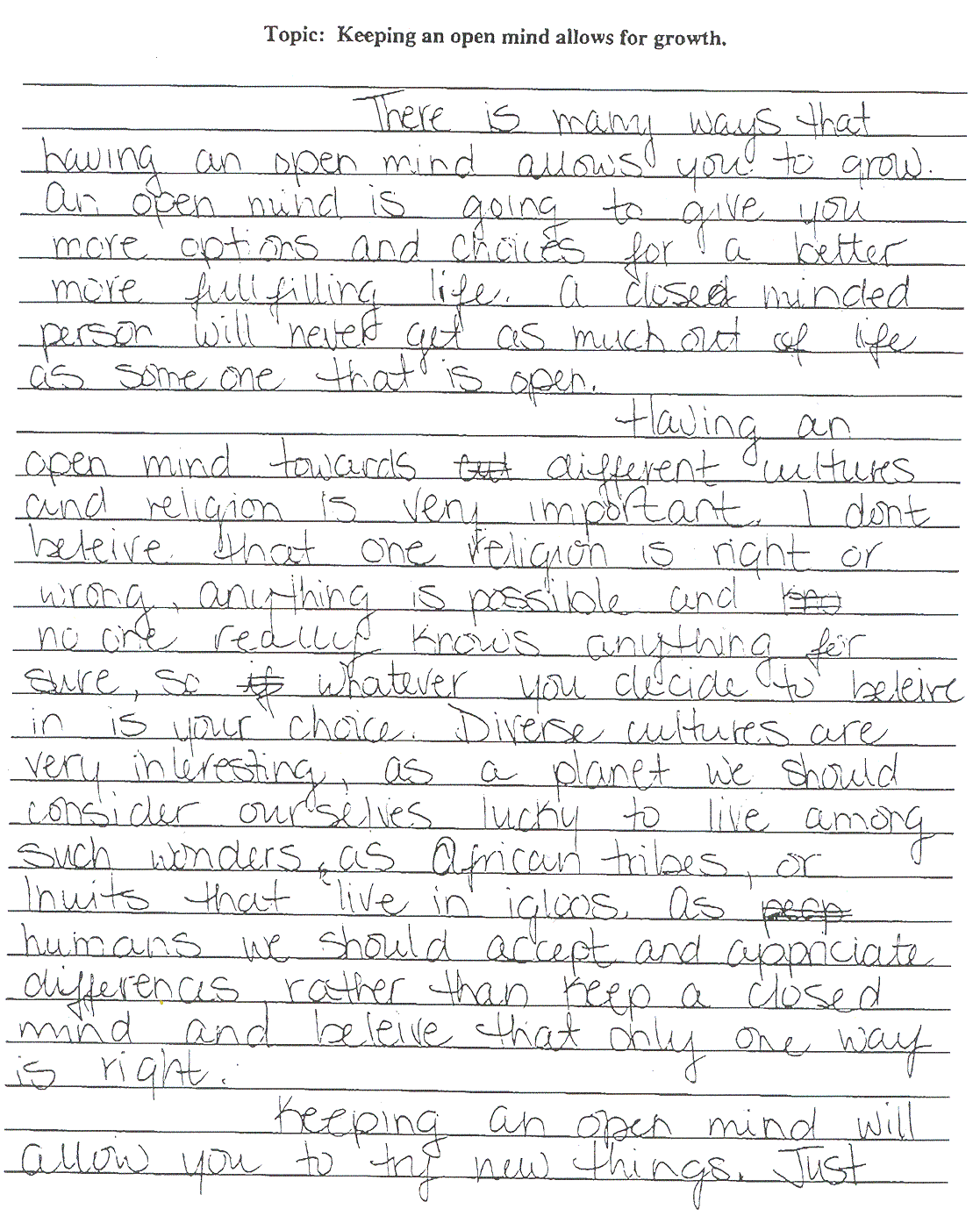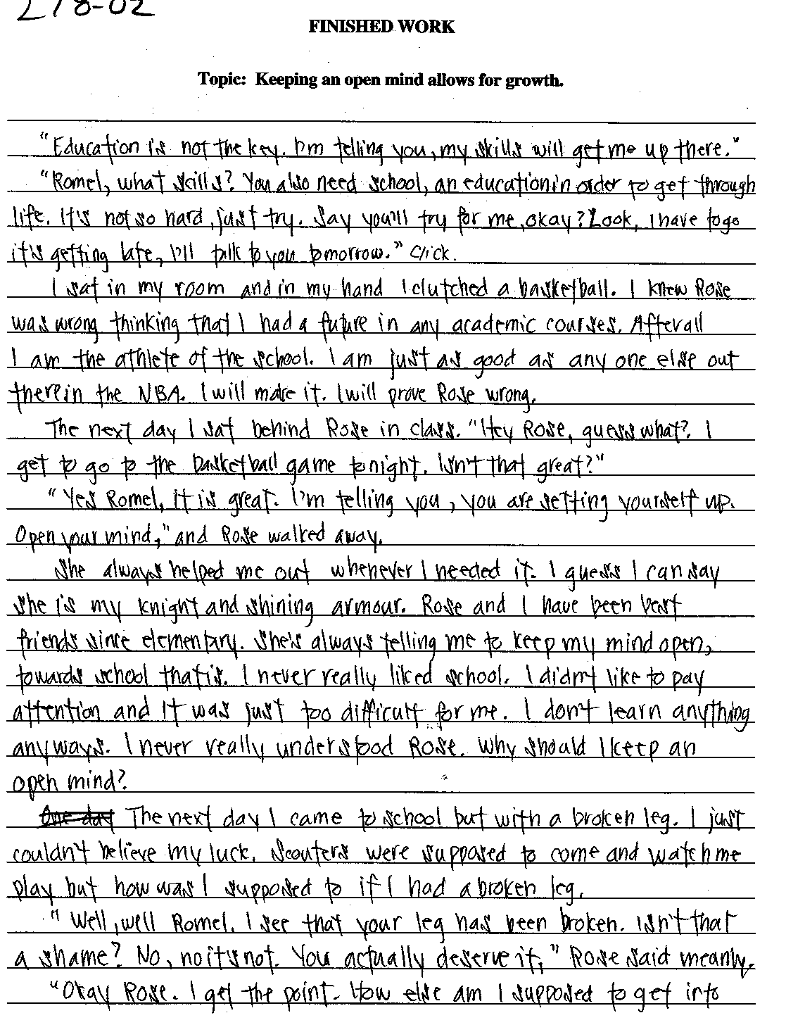 278 02 - Predictable narrative. The paper incorporates description and dialogue to make a rather obvious moral lesson. Mechanics are not flawless but errors are not glaring.