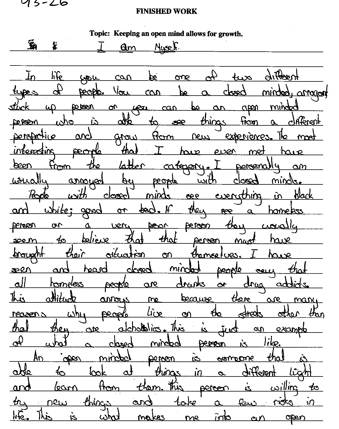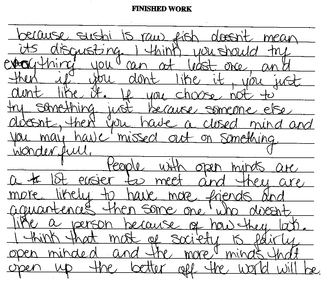 Provincial Examinations Student Writing Samples - Essay The 4 Response The four paper is clearly adequate. The prose is able to convey the writer's ideas, but without flair or strong control. Diction and syntax are usually appropriate, but lack variety. Structure, regardless of type, is predictable and relatively mechanical. The reader has a clear sense of the writer's purpose, but is not engaged by the prose. Conventions of language are usually followed, but the reader is aware of errors. 93 26 - This paper is on the higher end of the four scale point. It starts quite strongly, but becomes weaker as it develops. The third paragraph is repetitive. The exhortation of the conclusion is simplistic. In general the language of the essay is overly conversational in tone.