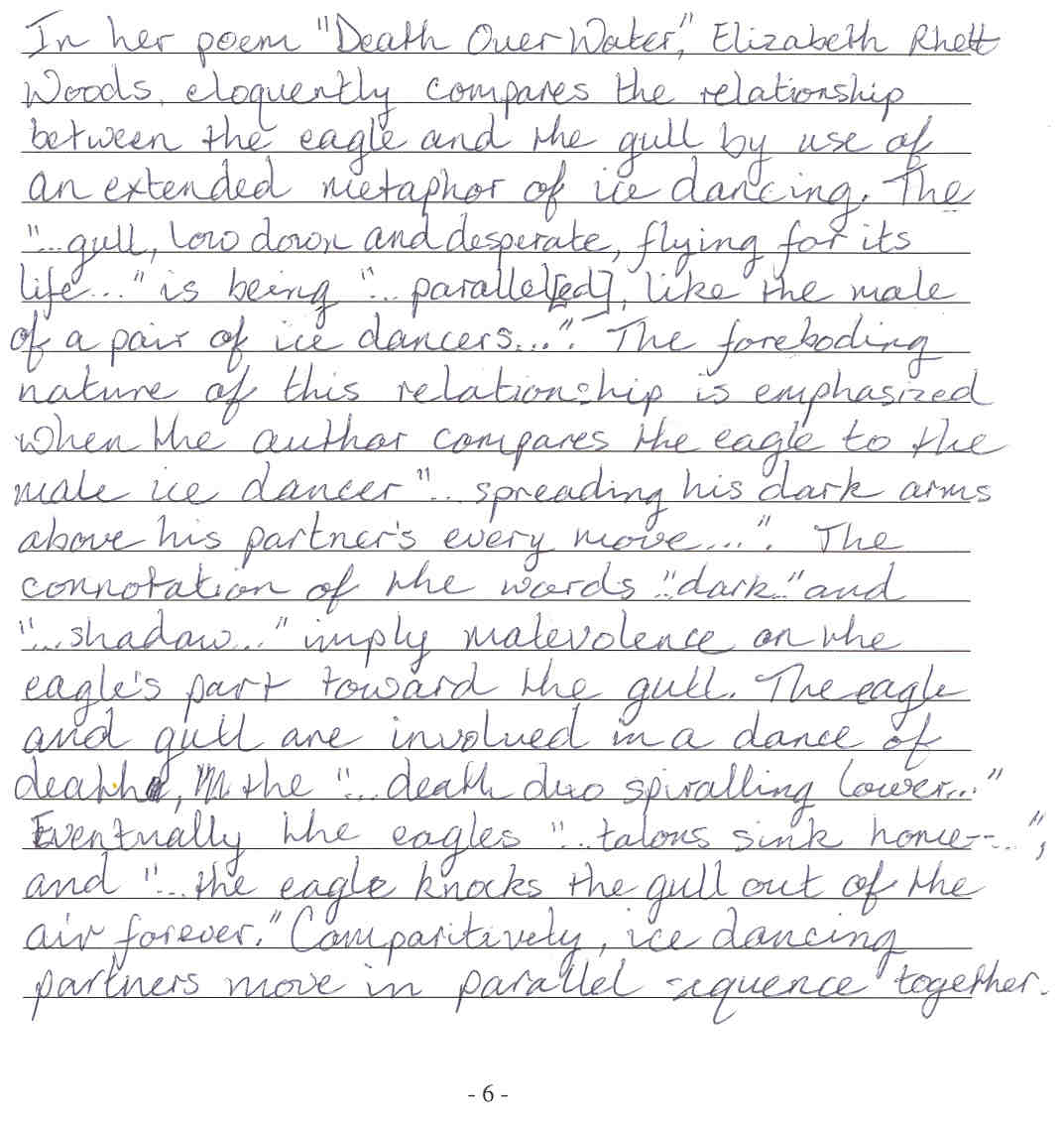 Provincial Examinations Student Writing Samples - Poetry The 6 Response The six response meets all the criteria of a five: its superiority to the five response is a result of degree, not kind. The level of insight may be particularly convincing and/or subtle or the writing exceptionally impressive. Certainly the six response exhibits a depth of understanding and a sophisticated use of language. 449 04 - A clear precise vocabulary highlights this superior response. The student forcefully demonstrates a mature understanding of the central metaphor. The specific reference to the crows as "anxious spectators" is indicative of this students level of understanding.