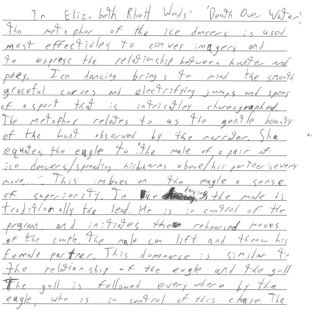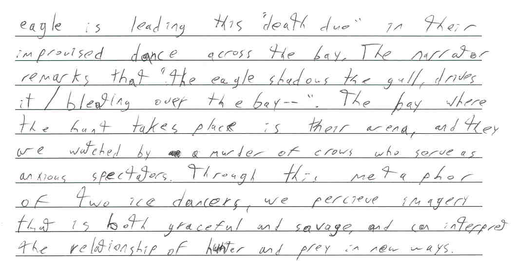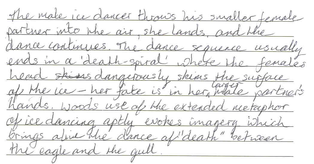 311 13 - A manipulation of the language involving imagery, sophisticated use of vocabulary, alliteration and other devices make this particular paragraph an engaging read. Excellent use of quotes, specific references to the poem and diction/verb choice are particularly evident. The word choice demonstrates a solid understanding which constitutes a higher level paper.