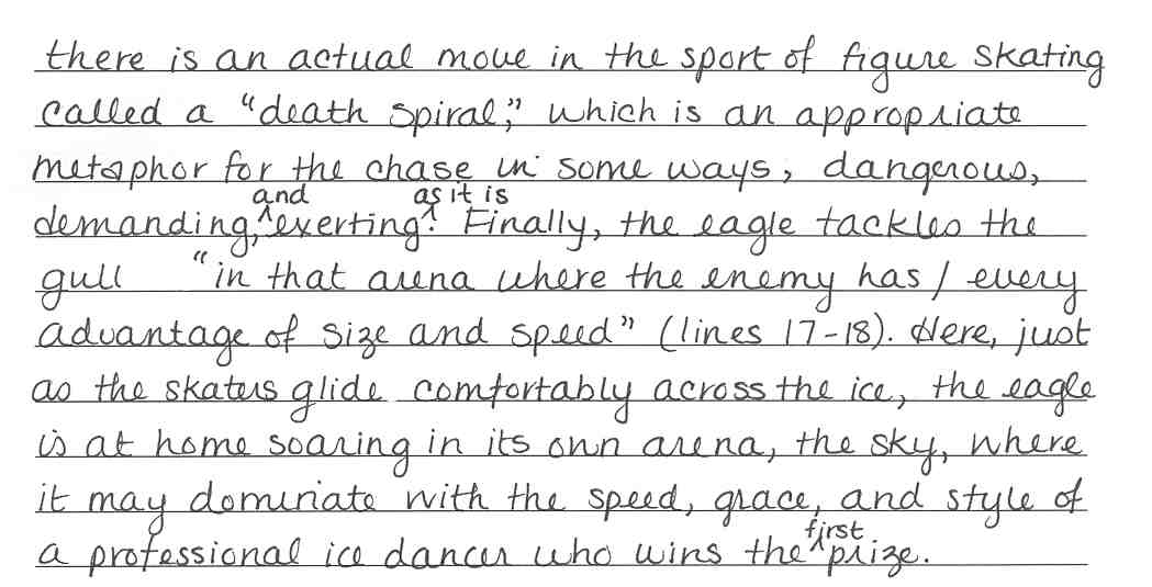 011 11 - This paper is noteworthy for its strong voice and unity of purpose. It immediately establishes the "malevolent" nature of the ice dancing partnership and proceeds to marshall strong evidence to support that insight. Vocabulary and syntax are sophisticated but it is the superiority of thought and logic which are particularly admirable.